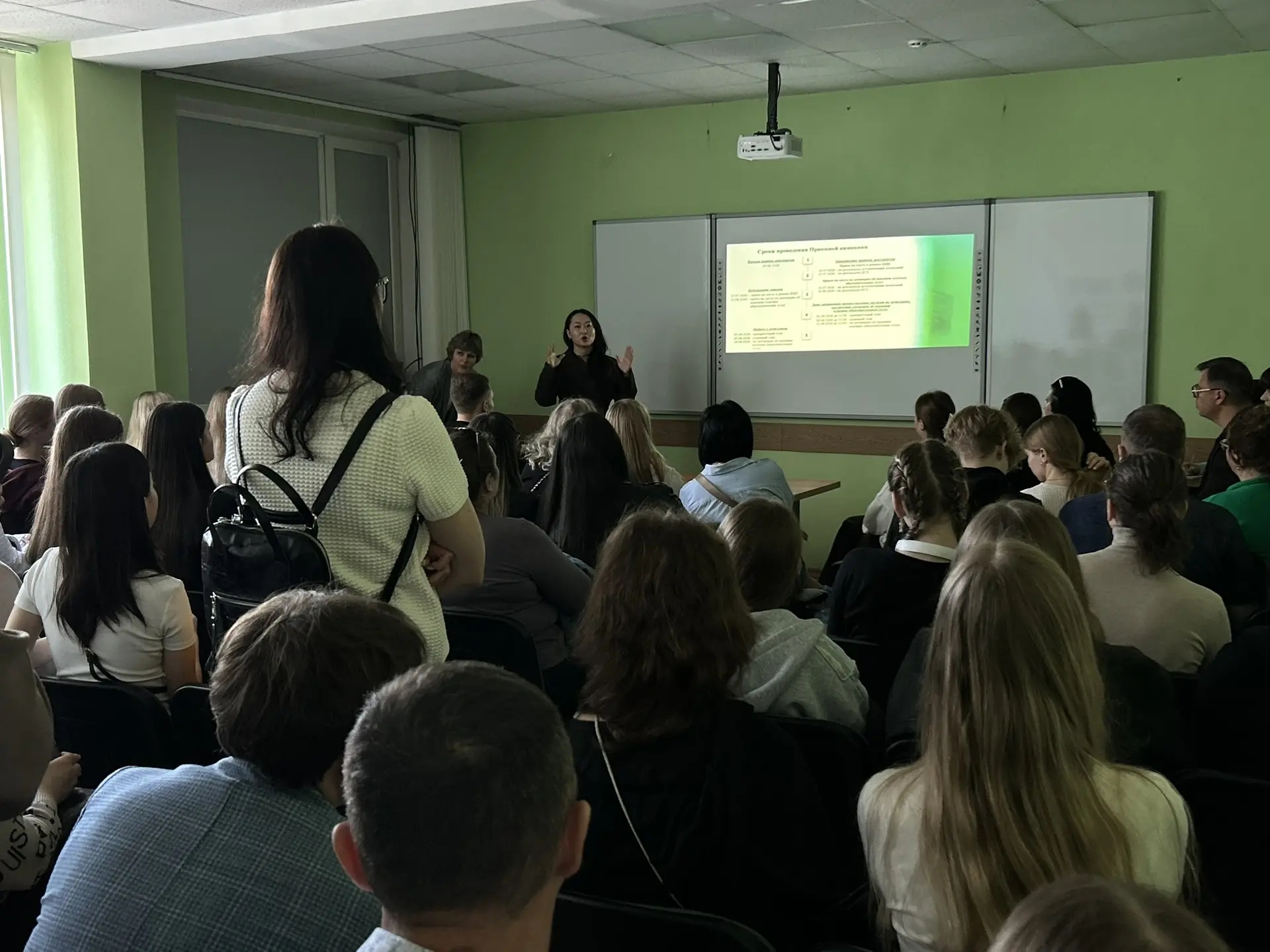 Декан факультета Юлия Македонова представила подробную информацию о контрольных цифрах приема на 2026 год, проходных баллах прошлого года и преимуществах целевого обучения, рассказала о востребованности выпускников ВолгГМУ и возможностях стажировок уже на старших курсах.