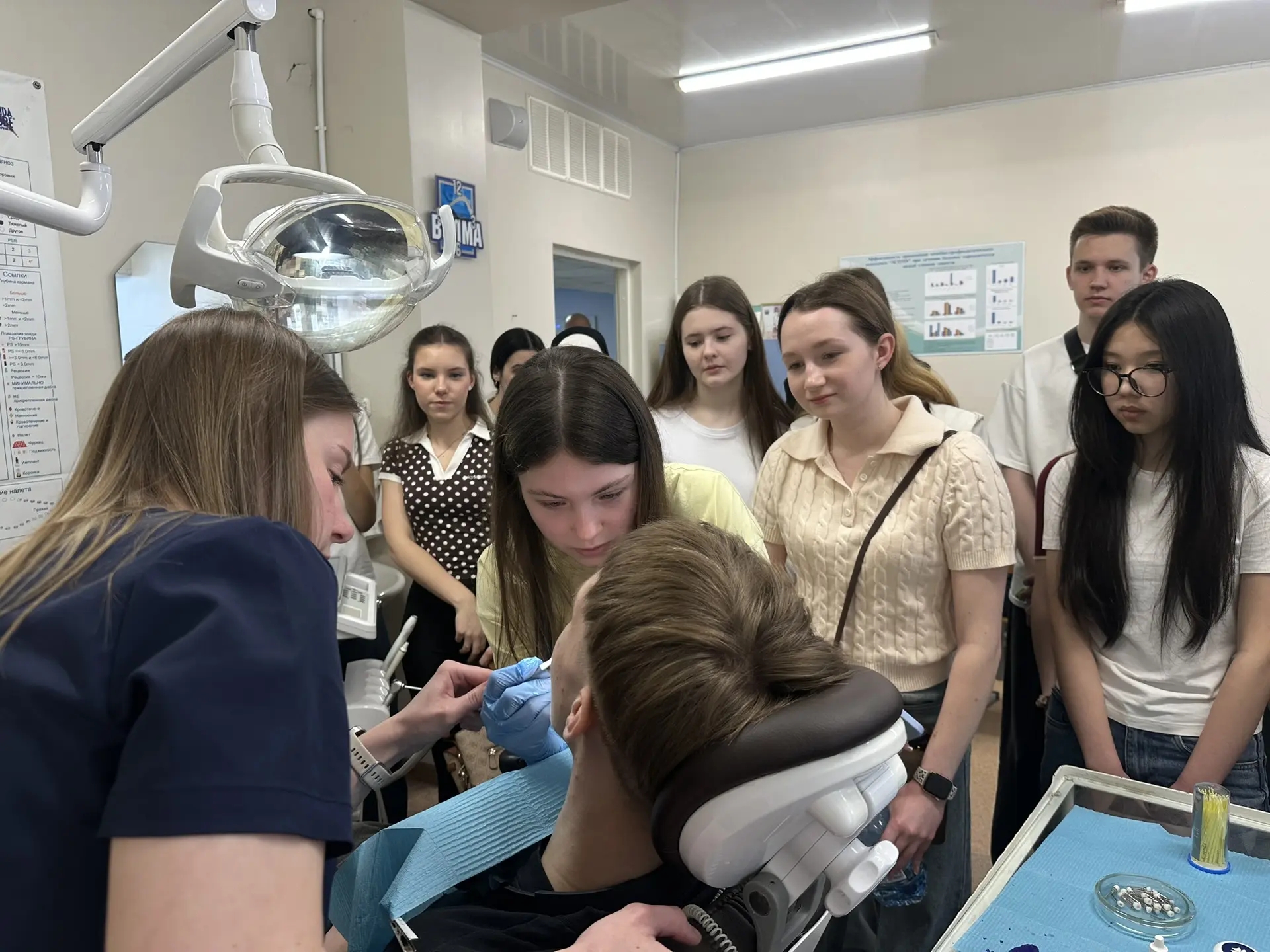 Основное внимание было уделено Центру стоматологических практик, где преподаватели кафедр терапевтической, хирургической стоматологии и ЧЛХ, пропедевтики стоматологических заболеваний провели серию мастер-классов. Будущие абитуриенты под контролем наставников попробовали препарировать зубы на фантомах, освоили базовые техники проведения анестезии и увидели особенности интраорального 3D сканирования.